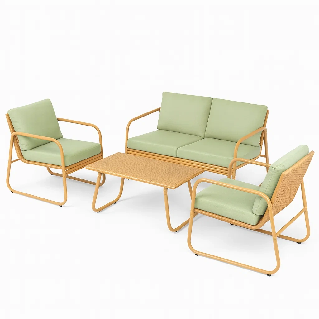 Materiale: Tavolo e sedie in legno massello, schienale in rattan, cuscini in tessuto di poliestere